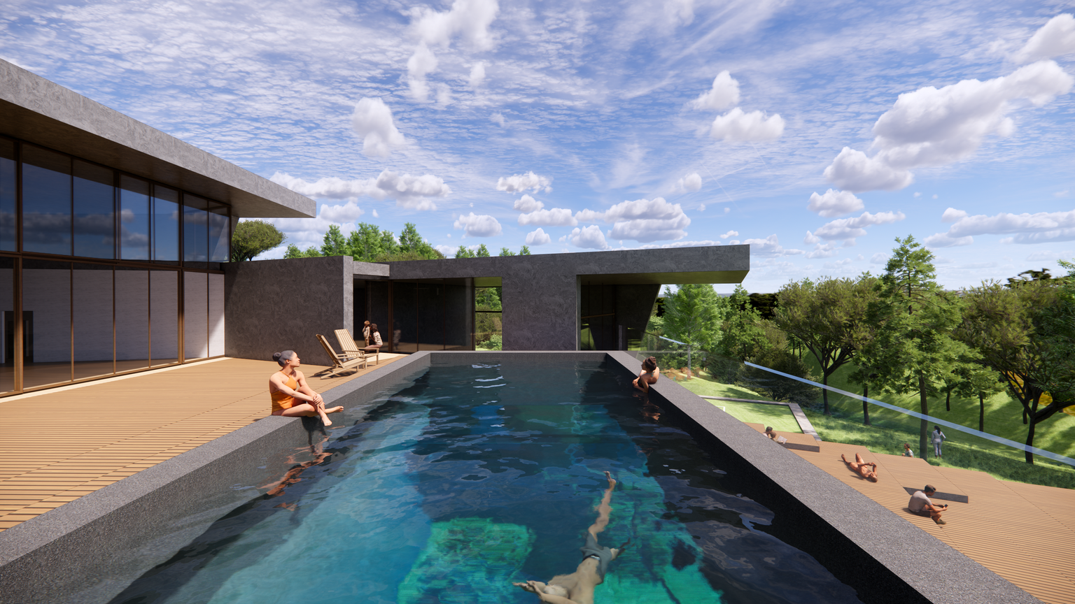 An outdoor pool captures the water, mimicking the arrival of the flood. The indoor swimming hole is located closest to the outdoor pool, ensuring the water is stored in an enclosed, protected indoor space. Additionally, a cold spa is located on the cliff, where it was discovered during the excavation of the quarry.