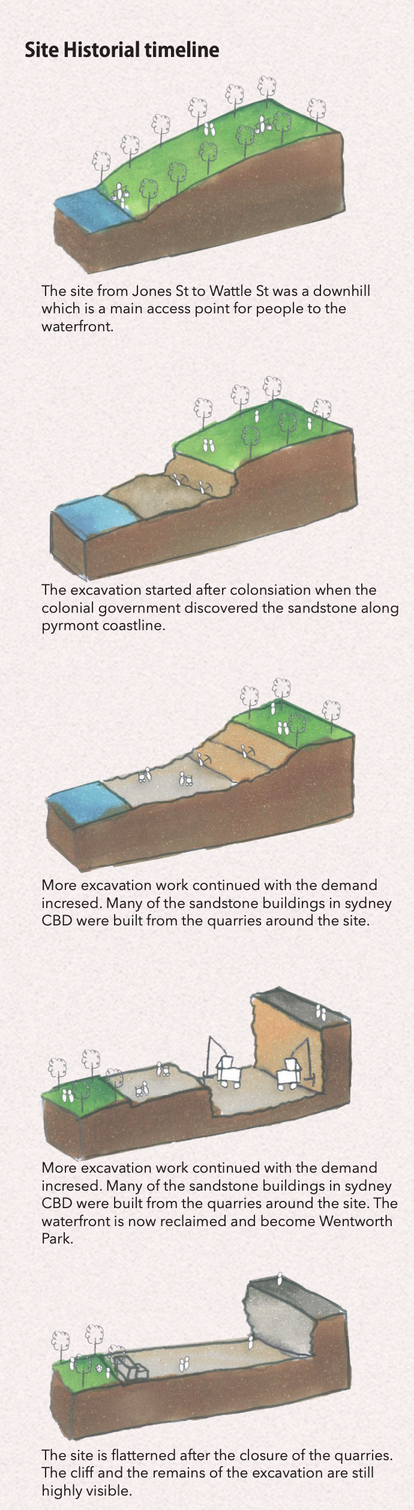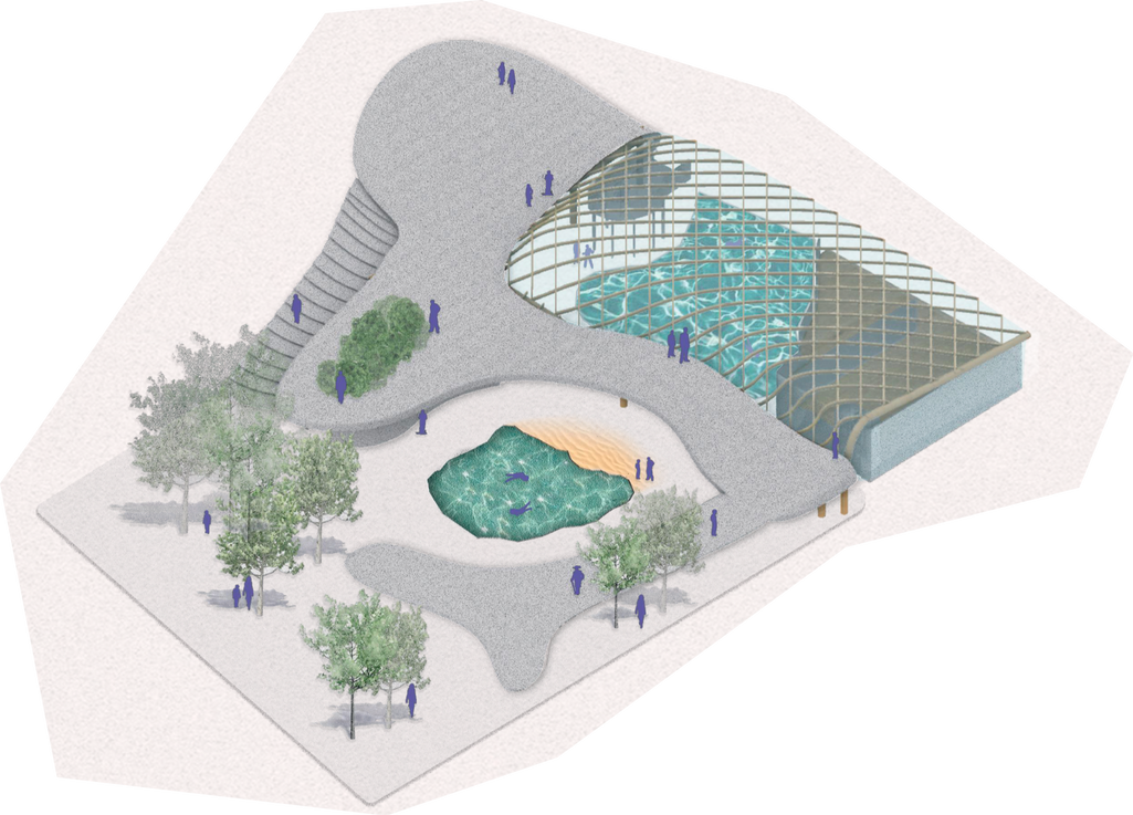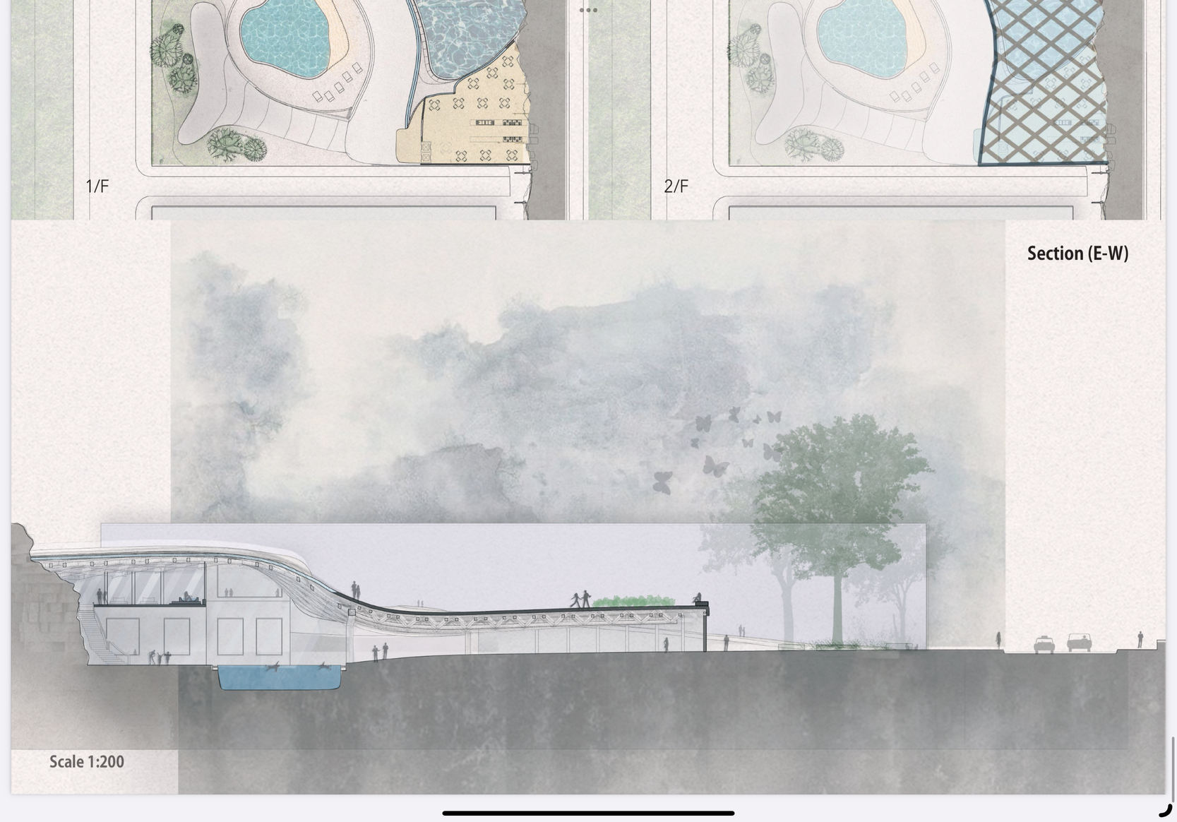 History meets nature in this urban paradise, designed to provide an escape for busy young adults and families. The "Urban Paradise" draws inspiration from the historic slope that once connected Jones Street to Wattle Street, which used to be a waterfront in Wentworth Park. By recreating this pathway, visitors can walk across the paradise and descend towards Wattle Street. The organic wave-like shape of the aquatic center creates spaces for a beach wave pool and an enclosed indoor swimming hole that looks towards the cliff, along with other facilities that make the journey unforgettable.